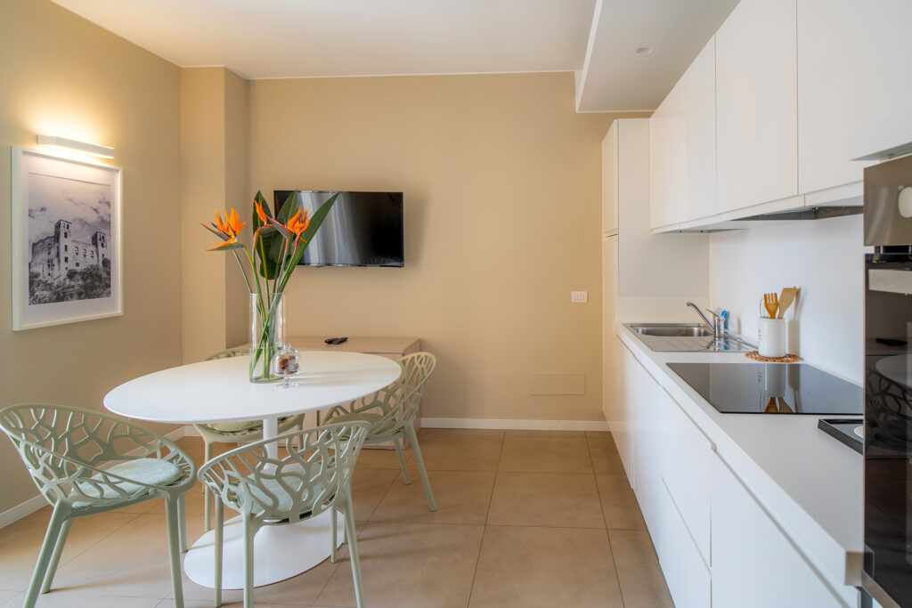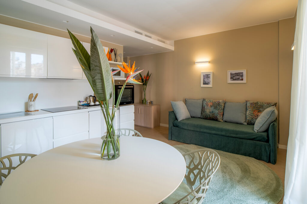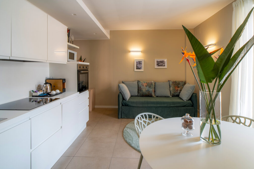 These pretty and spacious two-room apartments are approximately 50 m2 in size and are arranged to comfortably accommodate up to four people. They consist of a living area with a sofa bed, a kitchen corner and a bedroom with cupboards. Comfort is guaranteed with a fully equipped kitchen, including dishwasher and oven, washing machine, bathroom with window and shower, balcony with table and chairs and many other facilities. Full of air and light, the apartments offer a beautiful view of the city and the garden.